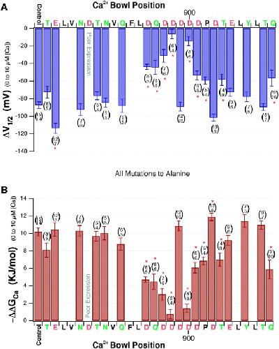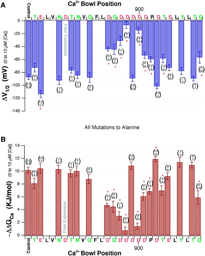 Figure 4. . Summary of the effects of point mutations in the Ca2+ bowl. (A) Change in average V1/2 in response to increasing [Ca2+] from 0.003 to 10 μM for each of a series of point mutations to alanine in the Ca2+ bowl. Each mutated amino acid and its position in the Ca2+ bowl is indicated along the horizontal axis. Residues with acidic side-chains are indicated in red. Other oxygen-containing side chains are indicated in green. Side-chains without oxygen are indicated in black. Mutant responses that are statistically significant relative to control (far left) are indicated with an asterisk. The number of measurements (n) for each data point is indicated in parentheses with the upper number indicating n for 10 μM and the lower number indicating n for 0.003 μM [Ca2+]. (B) Effect of raising [Ca2+] from 0.003 to 10 μM on the free-energy difference between open and closed. −ΔΔGCa (0.003–10 μM [Ca2+]) values were determined from G-V fits to Eq. 2 as described in the text. The following constant parameters were used: JC(0) = 0.059; JO(0) = 1.020; z = 0.51; q = 0.4. The dataset used in B is the same as in A.