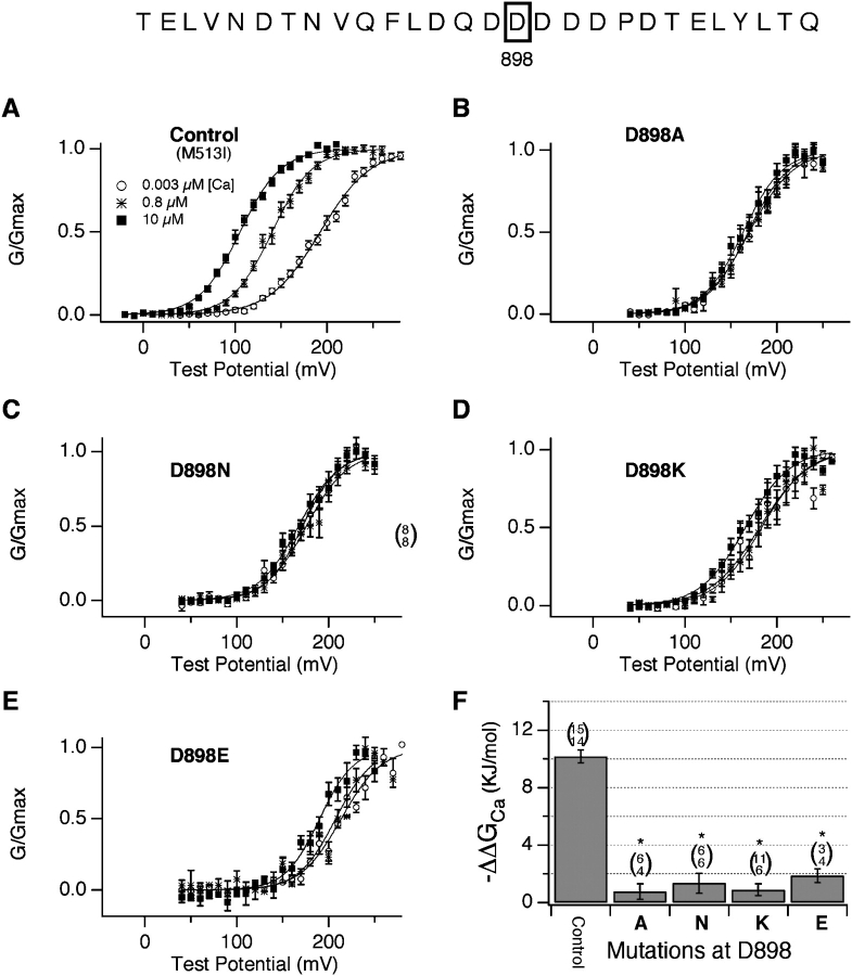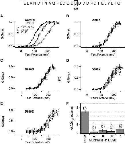 Figure 5. . Ca2+ sensing is very sensitive to the nature of the residue at position 898. G-V curves determined for (A) the control (M513I) channel, and (B–E) four mutations at position 898 as indicated. (F) The effect of raising [Ca2+] from 0.003 μM to 10 μM on the free-energy difference between open and closed. −ΔΔGCa (0.003–10 μM [Ca2+]) values were determined as described in the text. Control: as in the legend to Fig. 2. D898A: as in the legend to Fig. 3. D898N: 0.003 μM [Ca2+] V1/2 = 172 mV, z = 1.28; 0.8 μM [Ca2+] V1/2 = 176 mV, z = 1.15; 10 μM [Ca2+] V1/2 = 168 mV, z = 1.16. D898K: 0.003 μM [Ca2+] V1/2 = 181 mV, z = 0.95; 0.8 μM [Ca2+] V1/2 = 184 mV, z = 1.02; 10 μM [Ca2+] V1/2 = 166 mV, z = 1.05. D898E: 0.003 μM [Ca2+] V1/2 = 214 mV, z = 1.15; 0.8 μM [Ca2+] V1/2 = 208 mV, z = 1.25; 10 μM [Ca2+] V1/2 = 191 mV, z = 1.35.