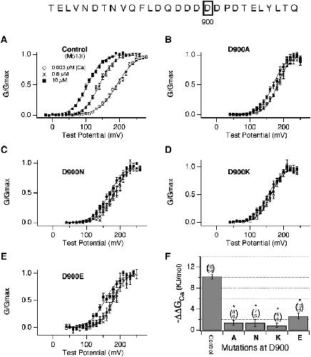 Figure 6. . Ca2+ sensing is very sensitive to the nature of the residue at position 900. G-V curves determined for (A) the control (M513I) channel, and (B–E) four mutations at position 900 as indicated. (F) The effect of raising [Ca2+] from 0.003 to 10 μM on the free-energy difference between open and closed. −ΔΔGCa (0.003–10 μM [Ca2+]) values were determined as described in the text. Control as in the legend to Fig. 2. D900A: as in the legend to Fig. 3. D900N: 0.003 μM [Ca2+] V1/2 = 184 mV, z = 1.20; 0.8 μM [Ca2+] V1/2 = 183 mV, z = 1.04; 10 μM [Ca2+] V1/2 = 170 mV, z = 1.03. D900K: 0.003 μM [Ca2+] V1/2 = 163 mV, z = 1.26; 0.8 μM [Ca2+] V1/2 = 162 mV, z = 1.38; 10 μM [Ca2+] V1/2 = 154 mV, z = 1.13. D900E: 0.003 μM [Ca2+] V1/2 = 181 mV, z = 1.39; 0.8 μM [Ca2+] V1/2 = 178 mV, z = 1.39; 10 μM [Ca2+] V1/2 = 155 mV, z = 1.10.