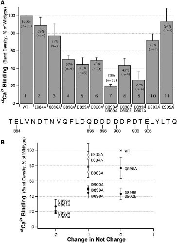 Figure 8. . Ca2+ binding for a series of mutant fusion proteins. (A) 45Ca2+-band densities from overlay assays are plotted as a percentage of wild-type band density for each of ten GST-mSlo207 fusion proteins. (B) 45Ca2+-band density is plotted for each mutant fusion protein as a function of the change in net charge each mutation brings about. Open circles indicate mutations outside the central acidic region of the Ca2+ bowl (896–901). Closed circles indicate mutations inside this central region.