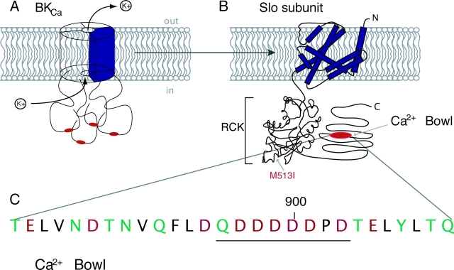 Figure 1. . General topology of the BKCa channel. (A) Diagram of the fourfold-symmetric BKCa channel, composed of four “slo” subunits. (B) Putative topology of a single subunit. Apparent is the integral-membrane domain (based loosely on the recent structure of the KvAP channel; Jiang et al., 2003) and the intracellular domain. In the latter are indicated the RCK domain, whose representation was modeled after the structure of the MthK channel's RCK domain (Jiang et al., 2002), and the Ca2+ bowl, whose structure is unknown. (C) Amino acid sequence of the Ca2+ bowl. Residues with acidic side chains are indicated in red. Other oxygen-containing side chains are indicated in green. Side chains without oxygen are indicated in black.