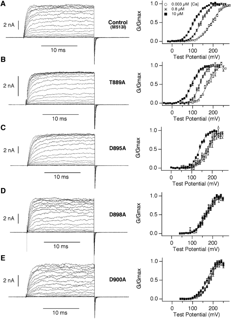 Figure 3. . Three classes of Ca2+-bowl point mutants. Shown are data from (A) our control (M513I) channel, (B) a mutant that showed little change in Ca2+ response, (C) a mutant whose Ca2+ response was reduced by approximately half, and (D and E) two mutants whose responses to 10 μM [Ca2+] were essentially eliminated. On the left are current families (10 μM [Ca2+]) representative of those used to generate the G-V curves on the right. Voltages are as follows. Control (M513I): hold −50 mV, test 0–180 mV. T889A: hold −80 mV, test 0–180 mV. D895A: hold −50 mV, test 0–200 mV. D898A: hold −50 mV, test 40–220 mV. D900A: hold −50 mV, test 40–230 mV. All repolarization were to −80 mV. G-V Boltzmann fit parameters where as follows. Control: as in the legend to Fig. 2. T899A: 0.003 μM [Ca2+] V1/2 = 172 mV, z = 1.21; 0.8 μM [Ca2+] V1/2 = 135 mV, z = 1.46; 10 μM [Ca2+] V1/2 = 96 mV, z = 1.24. D895A: 0.003 μM [Ca2+] V1/2 = 181 mV, z = 1.24; 0.8 μM [Ca2+] V1/2 = 173 mV, z = 1.08; 10 μM [Ca2+] V1/2 = 138 mV, z = 1.42. D898A: 0.003 μM [Ca2+] V1/2 = 170 mV, z = 1.06; 0.8 μM [Ca2+] V1/2 = 169 mV, z = 1.14; 0.8 μM; 10 μM [Ca2+] V1/2 = 163 mV, z = 1.17. D900A: 0.003 μM [Ca2+] V1/2 = 182 mV, z = 1.34; 0.8 μM [Ca2+] V1/2 = 182 mV, z = 1.33; 10 μM [Ca2+] V1/2 = 169 mV, z = 1.22.