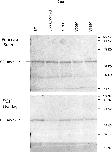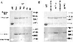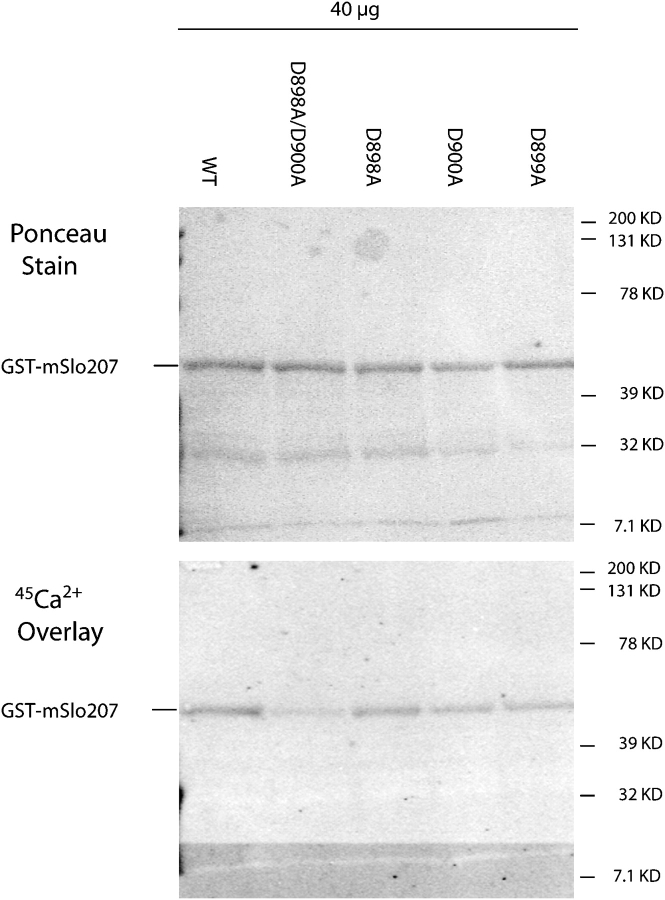 Figure 9. . Ca2+ binding to four Ca2+-bowl mutant fusion proteins. (Top) Ponceau-stained blot from a gel that had loaded onto it 40 μg of GST-mSlo207 and the mutants GST-mSlo207-D898A/D900A, GST-mSlo207-D898A, GST-mSlo207-D900A, and GST-mSlo207-D899A as indicated. (Bottom) Autoradiogram of the blot in the top panel after 45Ca2+ overlay (9.1 μM [Ca2+]) and wash.