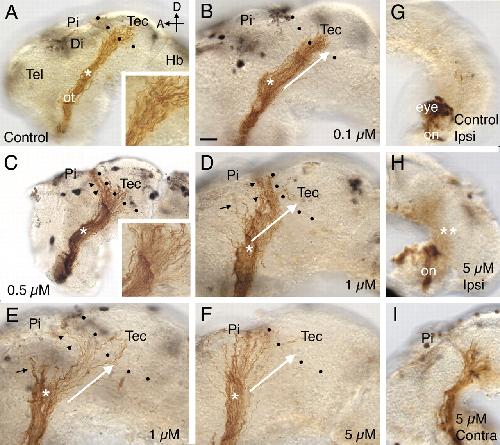 A–I, Pharmacological inhibition of ADAM10 causes defects in target recognition. HRP-labeled optic projections in stage 40 brains exposed at stages 31 or 33/34 to either a control solution (A, G) or a solution containing the ADAM10 inhibitor, GI254023X (B–F, H, I) are shown. Dotted lines show the approximate anterior border of the optic tectum. A, Control DMSO solution. Axons grow through the diencephalon, make a turn in the mid-diencephalon (asterisk), and innervate the optic tectum. The inset shows the behavior of axons at the border of the optic tectum. B, GI254023X (0.1 μM). The white arrow indicates the normal trajectory of RGC axons after the mid-diencephalic turn (asterisk) and has been included in D–F for comparison purposes. C, GI254023X (0.5 μM). Many RGC axons fail to recognize their target and turn and grow along the anterior border of the optic tectum (black arrowheads). The inset shows a high-power view of the optic projection at the border of the optic tectum. D, E, GI254023X (1 μM). Some axons fail to recognize the optic tectum (black arrowheads) or make an earlier guidance error at the mid-diencephalic turn (black arrows). F, GI254023X (5 μM). Most axons fail to turn in the mid-diencephalon (asterisk; compare trajectory of axons to that of the white arrow) and never reach the anterior border of the optic tectum. G–I, HRP-labeled RGC axons in stage 39 brains where only the optic chiasm was exposed at stage 31 to either a control solution (G) or a solution containing 5 μM GI254023X (H, I). In the G1254023X-treated brain (H), as in control (G), there is no obvious ipsilateral projection, and the optic nerve crosses over at the optic chiasm to the contralateral side of the brain and grows normally within the diencephalon that is not exposed to the inhibitor (I). Tec, Tectum; Pi, pineal gland; ot, optic tract; Di, diencephalon; Hb, hindbrain; on, optic nerve; Ipsi, ipsilateral; Contra, contralateral; D, dorsal; A, anterior; Tel, telencephalon. Scale bar: (in B) A, C, G–I, 50 μm; B, D–F, 30 μm.