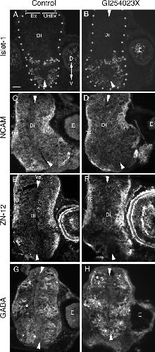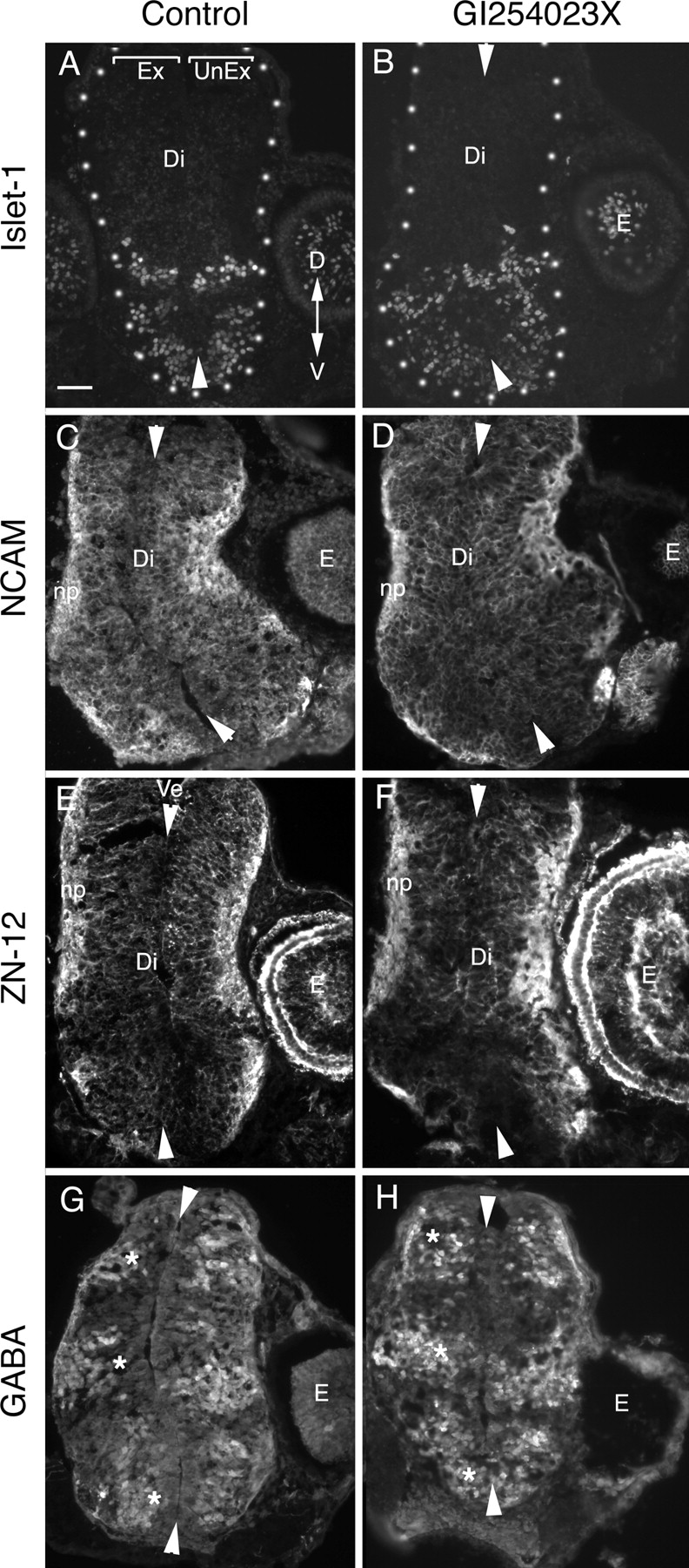 The pharmacological inhibitor GI254023X does not cause gross defects in the patterning of the diencephalic neuroepithelium. Neuroepithelial marker immunostaining of 12 μm cross sections of the diencephalon/midbrain regions of stage 40 embryos exposed at stage 33/34 to either 0.05% DMSO control medium (A, C, E, G) or 5 μM GI254023X (B, D, F, H). In all panels, the exposed side of the brain is on the left, and the unexposed side is on the right. Arrowheads point to the dorsal and ventral midline. Representative images are shown for the ventrally expressed transcription factor, Islet-1 (A, B), general neuronal markers NCAM (C, D) and Zn-12 (E, F), and the neurotransmitter GABA, which is expressed in three dorsal-to-ventral arrayed populations of neurons in the diencephalon (G, H, asterisk). No gross alterations in the pattern of expression of the antigens were observed between control and inhibitor-treated brains. Ex, Exposed side of brain; UnEx, unexposed side of brain; Ve, ventricle; Di, diencephalon; E, eye; np, neuropil; D, dorsal; V, ventral. Scale bar, 100 μm.