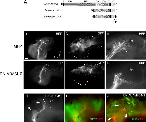 Misexpression of DN-ADAM10 in the dorsal neuroepithelium causes target recognition defects. A, Schematic diagram of the DNADAM10 constructs used in the electroporation and transfection experiments. S, Signal sequence; Pro, prodomain; MP, metalloproteinase domain; Dis, disintegrin domain; Cys, cysteine-rich region; TM, transmembrane domain; IC, intracellular domain; N, N terminal; C, C terminal. B–J, Transgene-expressing cells and HRP-labeled optic projections in lateral views of stage 40 brains. mRNA for GFP (B–D), GFP+DNXadam10 (E–I), and DNXadam10-mt (J) were injected into the anterior brain vesicles and electroporated into the dorsal neuroepithelium. At stage 40, the optic projections were anterogradely labeled with HRP, and the brains were processed for whole-mount immunochemistry with anti-HRP and anti-GFP or anti-myc. D and G are high-power views of the images shown in B and E, respectively. Note that many more axons enter the optic tectum in the control (D) than in the DNADAM10-expressing (G) brain. H shows an HRP-labeled optic projection in a brain electroporated with GFP+DNXadam10, and I illustrates the same projection along with expression of the coelectroporated GFP transgene. J shows immunolabeling with an antibody against the myc tag to visualize DNXADAM10-MT expression (green) and an antibody against HRP to visualize RGC axons (red). The arrows and arrowheads in H and J indicate target recognition and turning defects, respectively. The dotted lines outline the embryonic brain (C, F) and indicate the approximate anterior border of the optic tectum (B, D, E, G, H, J). Di, Diencephalon; Pi, pineal gland; Tec, tectum; D, dorsal; A, anterior. Scale bar: B, C, E, F, 50 μm; D, G–J, 25 μm.