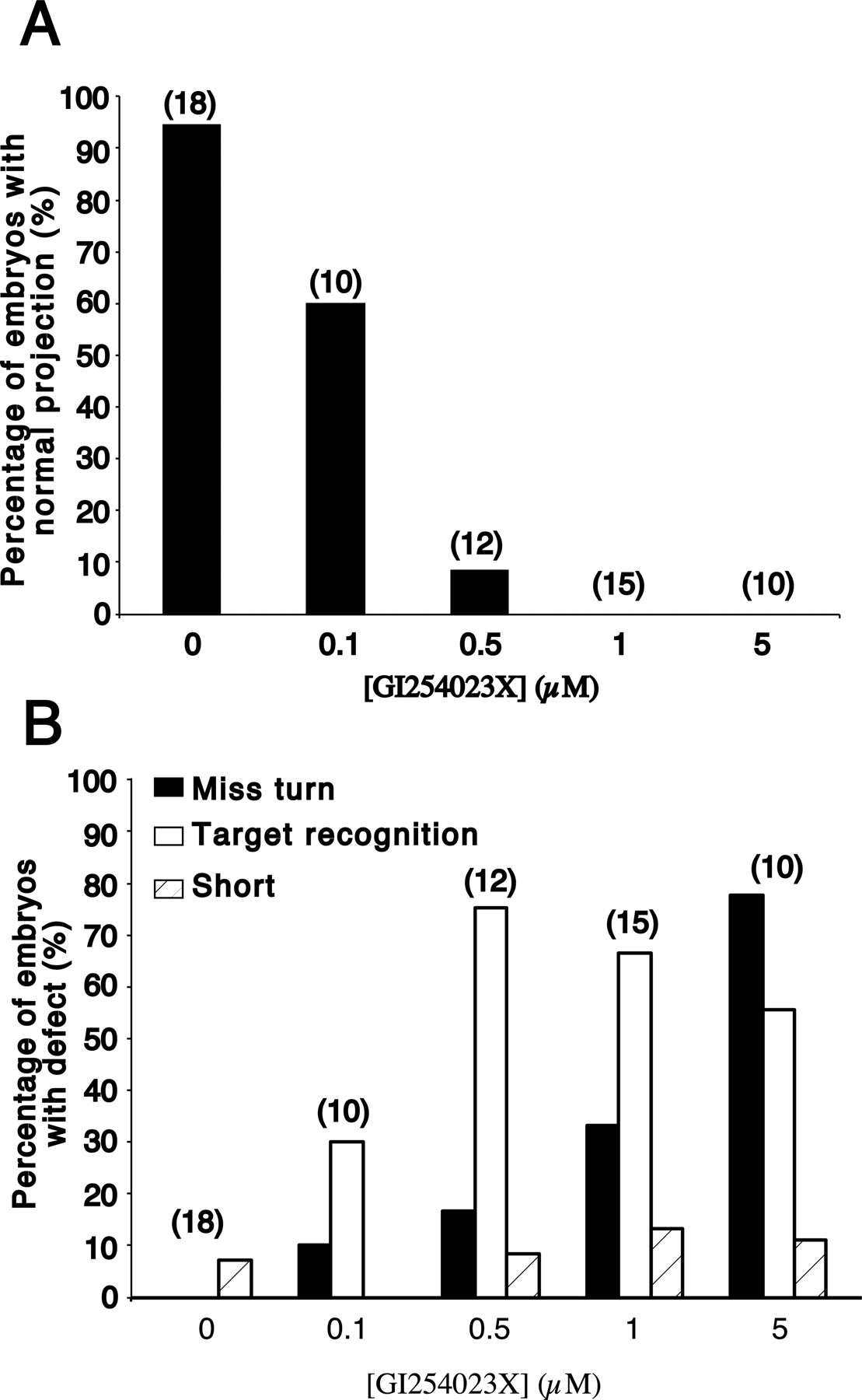 The ADAM10 pharmacological inhibitor has a dose-dependent effect on RGC axon guidance. A, Graph showing the percentages of embryos at different doses of GI254023X that have a normal RGC axon projection to the optic tectum. B, Graph showing the percentages of embryos at different doses of GI254023X that exhibit either defects in target recognition, guidance at the mid-diencephalic turn (Miss turn), or axon extension (Short). Note that some embryos show more than one defect and that the number of embryos showing target recognition defects decreases at 5 μM GI254023X because axons fail to make the turn in the mid-diencephalon and never reach their target. The numbers in parentheses are the numbers of embryos.