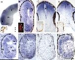 Xadam10 mRNA is expressed in the developing dorsal diencephalon and midbrain at the time RGC axons grow to the optic tectum. Expression of Xadam10 mRNA in a whole-mount brain and sections through the eye and brain at stages 32â37/38 as visualized by in situ hybridization with an antisense Xadam10 riboprobe is shown. A, Lateral view of a stage 33/34 whole-mount brain. Xadam10 mRNA is expressed in the dorsal diencephalon and optic tectum, but signal is much reduced in the ventral diencephalon. Similar expression is seen at stage 32 (data not shown). The inset shows a stage 40 brain with an HRP-labeled optic projection to compare the path taken by RGC axons with the expression of Xadam10 mRNA. B, Stage 32. Expression in the retina is widespread, including the RGC layer (brackets indicate the RGC layer, which is just forming) as indicated by immunolabeling for the Islet-1 transcription factor (inset), although little or no signal is observed in the developing outer nuclear layer (arrowhead). C, D, Stage 35/36. Xadam10 mRNA is still expressed in the dorsal diencephalon (C) and the optic tectum (D). The expected location of the distalmost part of the optic projection is indicated by asterisks, and insets show the location of HRP-labeled RGC axons (red-brown) in comparable brain sections. E, F, Stage 35/36. In a section through the more peripheral retina (E), Xadam10 mRNA is expressed in the innermost layers of the retina, including the RGC layer (indicated by brackets), as well the proliferative ciliary marginal zone. In sections through the central retina (F), Xadam10 mRNA expression is patchy (compare labeling in the RGC layer in both panels). G, Sense control at stage 33/34. H, By stage 37/38, Xadam10 mRNA is mainly localized to the inner nuclear layer and absent or greatly reduced in the outer nuclear and RGC layers. T, Optic tectum; Pi, pineal gland; Di, diencephalon; Ve, ventricle; ONL, outer nuclear layer; INL, inner nuclear layer; PE, pigment epithelium; cmz, ciliary marginal zone; L, lens; D, dorsal; V, ventral; Tel, telencephalon. Scale bar: (in H) A, 100 μm; C, D, 75 μm; B, EâH, 40 μm.