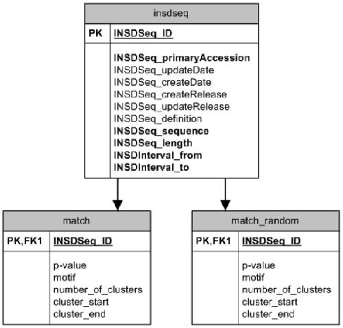 Figure 1. Schematic representation of the information stored in the 3'-UTR SIRF database. Sequences were extracted from the Mammalian Gene Collection (NCBI) and stored in the insdseq table of the database. REPFIND was then used to identify clusters of all perfect repeats in the 3'-UTRs of these sequences. The results of this computational analysis were stored in the 'match' table. A similar table, 'match_random' was generated on the same sequences which had their nucleotides shuffled in a random fashion. All information included in the insdseq table is from the NCBI database, except INSDSeq_Create_release, which defines when the table entry was created and INSDSeq_Update_release, which identifies when the table entry is modified. INSDSeq_ID is used as the identification number into the table. It has the same role as INSDSeq_primaryAccession, but is used because it is an integer that is more efficient for indexing. INSDSeq_ID in the match and match_random tables indicates the gene corresponding to the cluster identified by REPFIND. In addition, the P-value, sequence of the repeat (motif), number of motifs, start (cluster_start), and end (cluster_end) of each cluster are shown. These last two entries are used to calculate the size of each identified cluster.