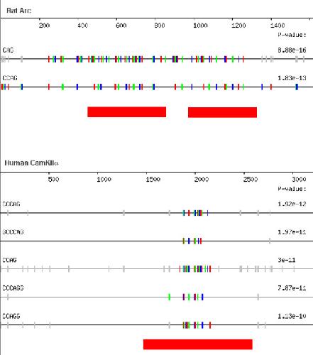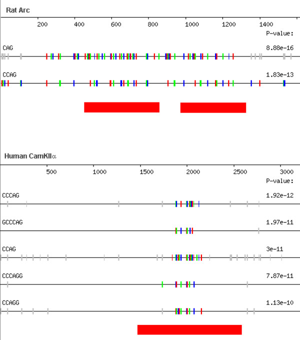 Figure 5. REPFIND analysis of dendritic mRNAs CamKIIα and Arc. The 3'-UTR of rat Arc (Acc. #NM_019361) and human CamKIIα (Acc. #BC012321) were analyzed for all repeats. As can be seen, CAG or CAG-containing motifs comprise the top scoring cluster for each 3'-UTR. Motifs depicted as vertical small colored bars indicate the cluster with the most significant P-value. The red bars below each 3'-UTR represent RNA sequences that have dendritic RNA localization activity and were mapped in previous studies using reporter assays [28, 29].