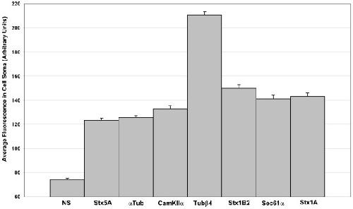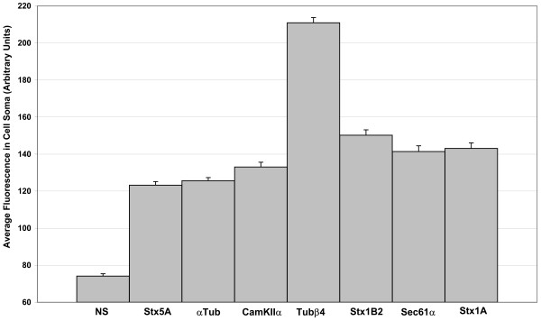Figure 6. Verification that in situ hybridization labels specific endogenous transcripts. To verify that the in situ hybridization detects specific endogenous transcripts, average labelling of the cell bodies was quantified from more than 30 cells for each probe and compared to a non-specific (NS) RNA probe. Error bars show standard error of the means. The Student t-Test shows all probes produce much stronger labelling in the cell body than observed with the non-specific probe (P < 0.0001) which was not different than labelling seen when the RNA probe was completely omitted from an otherwise identical protocol (data not shown). The in situ procedure used for these studies was adapted from a previous study [34]and involved hybridization of a digoxigenin-labelled RNA probe, labelling of this probe with an anti-digoxigenin fluorescein-conjugated antibody followed by amplification with a secondary Cy3-conjugated mouse monoclonal anti-fluorescein antibody. All images were acquired on a Zeiss LSM 510 confocal laser scanning microscope.