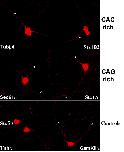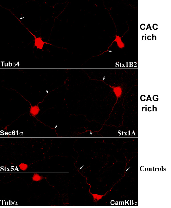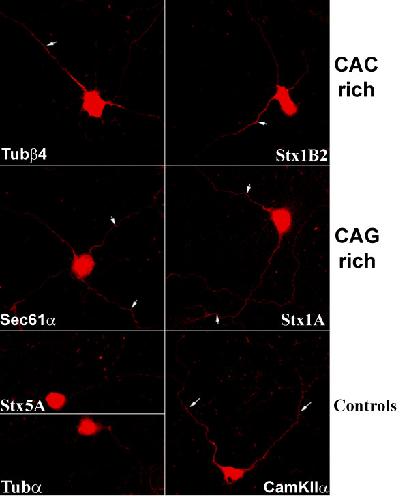 Figure 7. Endogenous CAC and CAG rich mRNAs are localized to distal processes in mammalian neurons. In situ hybridization was used to reveal the subcellular distribution of each mRNA in rat hippocampal neurons that had been cultured for 8 days after plating. Stx5 was used as a negative control for localization since it has no repeats and resides exclusively in the cell body. CamKIIα was used as a positive control for localization since it is well known to localize well to distal processes. White arrows show labelling in distal processes. All images were collected at identical laser settings using confocal microscopy and all images were processed together as a montage image to enhance contrast. In addition all cells came from the same experiment and each cell has multiple processes in the focal plane, but often a single process is preferentially labelled. The identity of processes as either axons or dendrites is not yet known. Specific mRNAs were detected in distal processes with both CAC-rich mRNAs (Tubβ4 and Syn1B2) and both CAG-rich mRNAs (Syn1A and Sec61α) that were identified with 3'-UTR SIRF. The cell bodies in these images are approximately 15 μm in diameter.