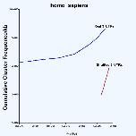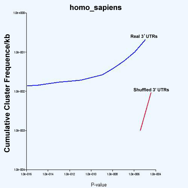 Figure 2. Cumulative cluster frequencies of CAC-containing motifs in human 3'-UTRs. Trends was used to determine the cumulative frequencies of clusters of 5–7 nucleotide long CAC-containing repeated motifs in the 'match' table (blue line) and 'match_random' table (red line). As can be seen, the frequencies of CAC-containing motifs with low P-values are much higher in real 3'-UTRs than they are in the shuffled ones. This type of separation is seen in all seven vertebrate species and with independently shuffled control data sets (data not shown).