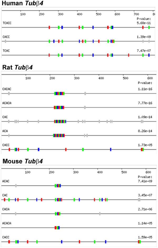 Figure 4. Mouse, Rat, and Human Tubβ4 3'-UTRs all have an abundance of CAC-containing motifs. Even though the human Tubβ4 3'UTR has little sequence similarity when it is aligned with the mouse or rat orthologs, all three genes are shown to have a highly significant number of CAC motifs when individually assessed by REPFIND. For the rat and mouse sequences, REPFIND was performed without filtering low complexity regions and the human background was used. The accession number for the mouse Tubβ4gene is BC054831. Motifs depicted in grey would have yielded higher (less significant) P-values, and therefore were not used to generate the P-values shown.