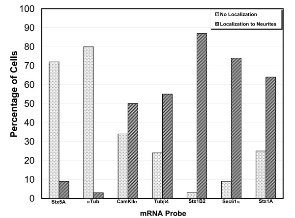 Figure 8. Semi-quantitative analysis of the localization of endogenous mRNAs. To estimate the extent of localization of each endogenous mRNA, images were collected from 30–40 cells using identical laser settings from the same experiment shown in Figure 7. All raw images were assembled into a montage and a threshold was applied to help identify mRNA labelled in distal processes. A cell was considered to be positive for localization if mRNA could be detected in a process greater than 40 μm away from the cell body. If no signal could be detected greater than 10 μm away from the cell body the cell was considered to be negative for mRNA localization. About 15–30 percent of all cells showed some signal in processes 10–40 μm away from the cell body. These cells were excluded from the graph since they added little information to this analysis.