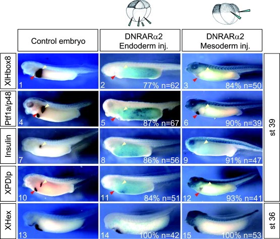 Fig. 5. Blocking RA signalling specifically in either the endoderm or the mesoderm of whole embryos interferes with pancreas specification. To block RA signalling specifically in the endoderm, DN-RARα2 was injected into the vegetal pole of 8-cell stage embryos together with the lineage tracer β-gal. In order to block RA signalling in the mesoderm, DN-RARα2 and β-gal were co-injected into the marginal zone of the two dorsal blastomeres in 4-cell stage embryos. The injected embryos were cultivated until control siblings had reached stage 36 or stage 39, and subjected to β-gal staining before whole mount in situ hybridization was carried out. (panels 1â3) Lateral view of stage 39 embryos stained for XlHbox8 expression (anterior towards the left), (panels 4â6) Ptf1a/p48 expression, (panels 7â9) insulin expression, (panels 10â12) XPDIp expression, (panels 13â15) Xhex expression. Red arrowheads demarcate the position of the ventralpancreas, white arrowheads the position of the dorsal pancreas. The statistics obtained are indicated at the right bottom corner of each panel.