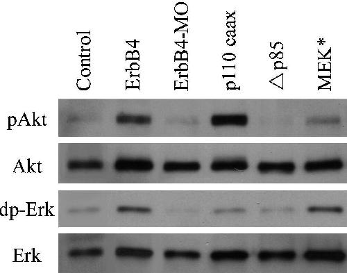 Fig. 2. ErbB signaling regulates activation of PI3K and ErkMAPK pathways in Xenopus DMZ explants. DMZ explants from embryos overexpressing ErbB4 (1 ng mRNA/embryo), ErbB4-MO (20 ng MO/embryo), p110caax (1 ng mRNA/embryo), Îp85 (1 ng mRNA/embryo) or MEKâ(1 ng mRNA/embryo) were examined at gastrula stages for activation of PI3K (pAkt) or ErkMAPK (dp-Erk) pathways. Overexpression of ErbB4 enhanced, while depletion of ErbB4 reduced, the levels of both pAkt and dp-Erk. p110caax and MEKâ stimulated pAkt and dpErk, respectively; but they also weakly increased phosphorylation of the other pathway component, suggesting a crosstalk between the two pathways.