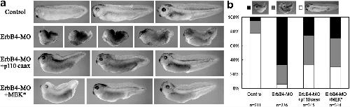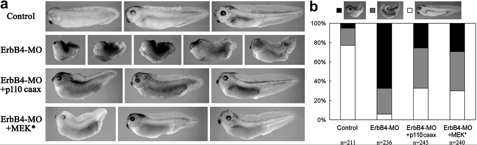 Fig. 3. Activation of PI3K or ErkMAPK rescued gastrulation defects in ErbB4 morphant embryos. (a) Coinjection of 5â10 pg of p110caax or MEKâ RNA rescued the open blastopore and axial defects induced by depletion of ErbB4 (20 ng ErbB4-MO/embryo). (b) Embryos with different phenotypes were counted and summarized in the bar graph.