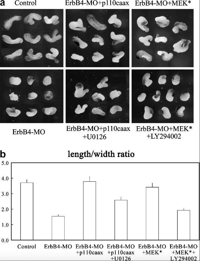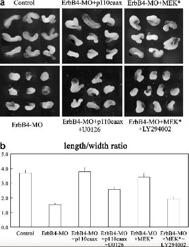 Fig. 5. Both PI3K and MAPK are required for optimal rescue of convergent extension in ErbB4-depleted explants. (a) 20 μM of U0126 or LY294002 were applied at stage 10 to DMZ explants from ErbB4-depleted (20 ng ErbB4-MO/embryo) and p110caax or MEKâ (5â10 pg mRNA/embryo) rescued embryos, respectively. While both p110caax and MEKâ rescued convergent extension of the explants, treatment with either U0126 or LY294002 reduced the elongation of the explants. (b) Morphometric analyses of the elongation of the DMZ explants (15 explants for each sample). The length-to-width (L/W) ratios of the DMZ explants were measured and calculated, and the statistical significance of the differences was analyzed using Studentâs t-test. The difference between control and ErbB4-morphant was significant (p-value less than 0.0005), but the control and the rescued samples were not significantly different (p-values of 0.81 and 0.37 for p110caax and MEKâ rescued samples, respectively, compared with the control explants). Treatment of the rescued samples with the chemical inhibitors significantly decreased the L/W ratios of the explants (p-values less than 0.003 compared with the control or the rescued explants).