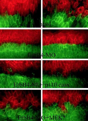Fig. 6. Activation of PI3K and ErkMAPK rescued mediolateral intercalation of dorsal mesodermal cells. Membrane-tethered fluorescent proteins (EGFP and Cherry) were injected separately into two dorsal blastomeres of 4-cell embryos, together with ErbB4-MO (20 ng/embryo) and RNAs encoding p110caax or MEKâ (5â10 pg/embryo). Cells from ErbB4 morphant embryos respected the midline and did not intermingle, but cells co-expressing the MO and p110caax or MEKâ intercalated with each other, so that cells with different fluorescent signals mixed across the midline.