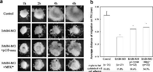 Fig. 7. PI3K and MAPK rescued headmesoderm migration on fibronectin. (a) Migration of headmesoderm was impaired in explants from ErbB4 morphant embryos (20 ng ErbB4-MO), and both p110caax and MEKâ (5â10 pg mRNA) rescued the cell migration. The distance of migration was enhanced, and the cellâcell contact between the migratory cells was restored. (b) Activation of either p110caax or MEKâ rescued the distance of headmesoderm migration partially but significantly (with p-values of 0.03 from Studentâs t-test). The percentage of the explants that maintained cellâcell adhesion was also greatly improved, with p110caax rescued the adhesion more efficiently to a level with no statistical difference from that of control (p = 0.16; for MEKâ, p = 0.03).