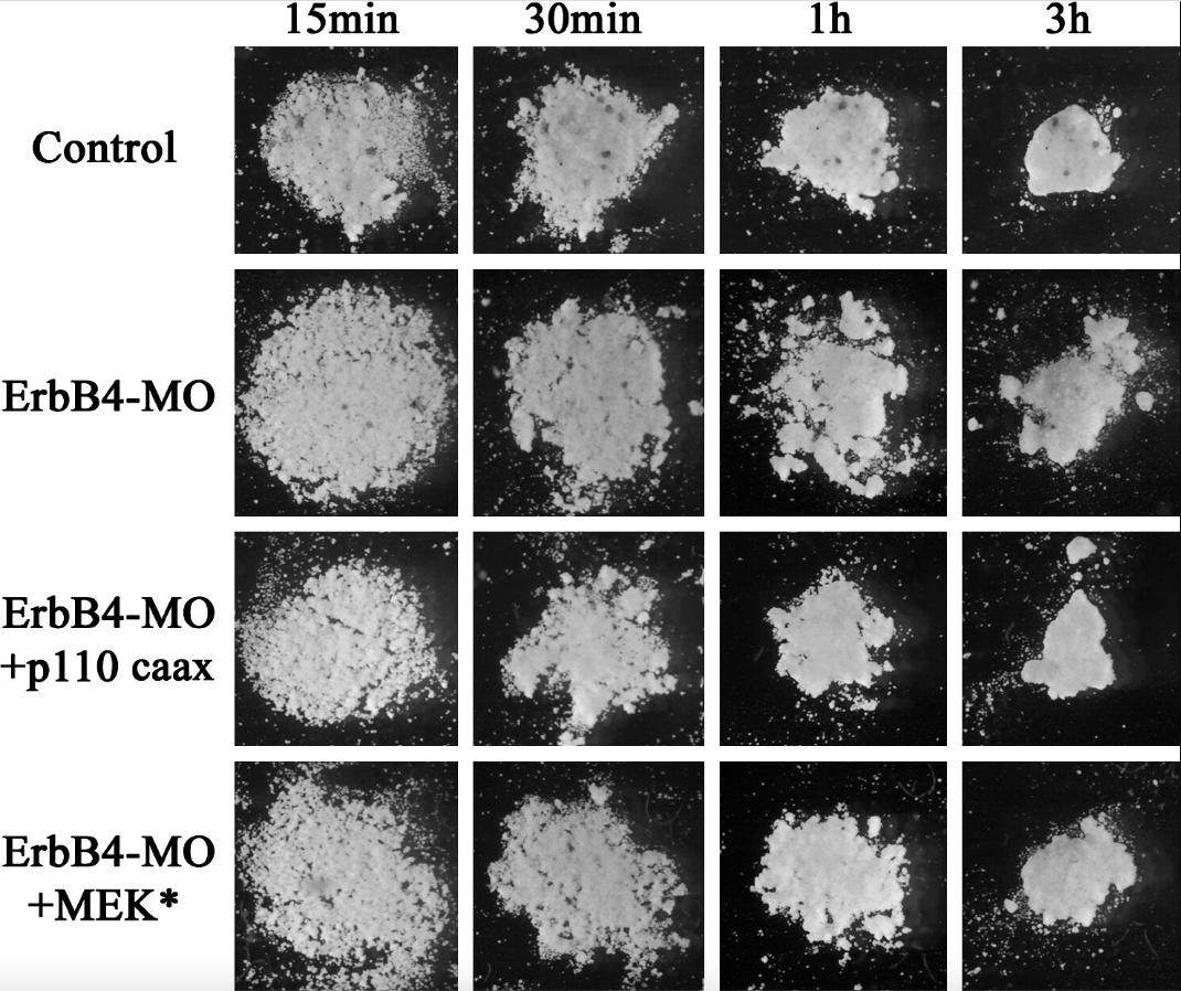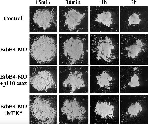 Fig. 8. PI3K rescued cellâcell adhesion more efficiently than ErkMAPK. Dorsal mesodermal cells were dissociated for an hour before reaggregated on agarose-coated dish for 3 h. Cells from ErbB4 morphant embryos (20 ng ErbB4-MO) did not reaggregate well, so that loose clusters formed. Coexpression with p110caax (5â10 pg mRNA) effectively rescued cell adhesion to a level similar to that of control, while MEKâ (5â10 pg mRNA) was less efficient in the rescue, so that aggregates were looser in structure.