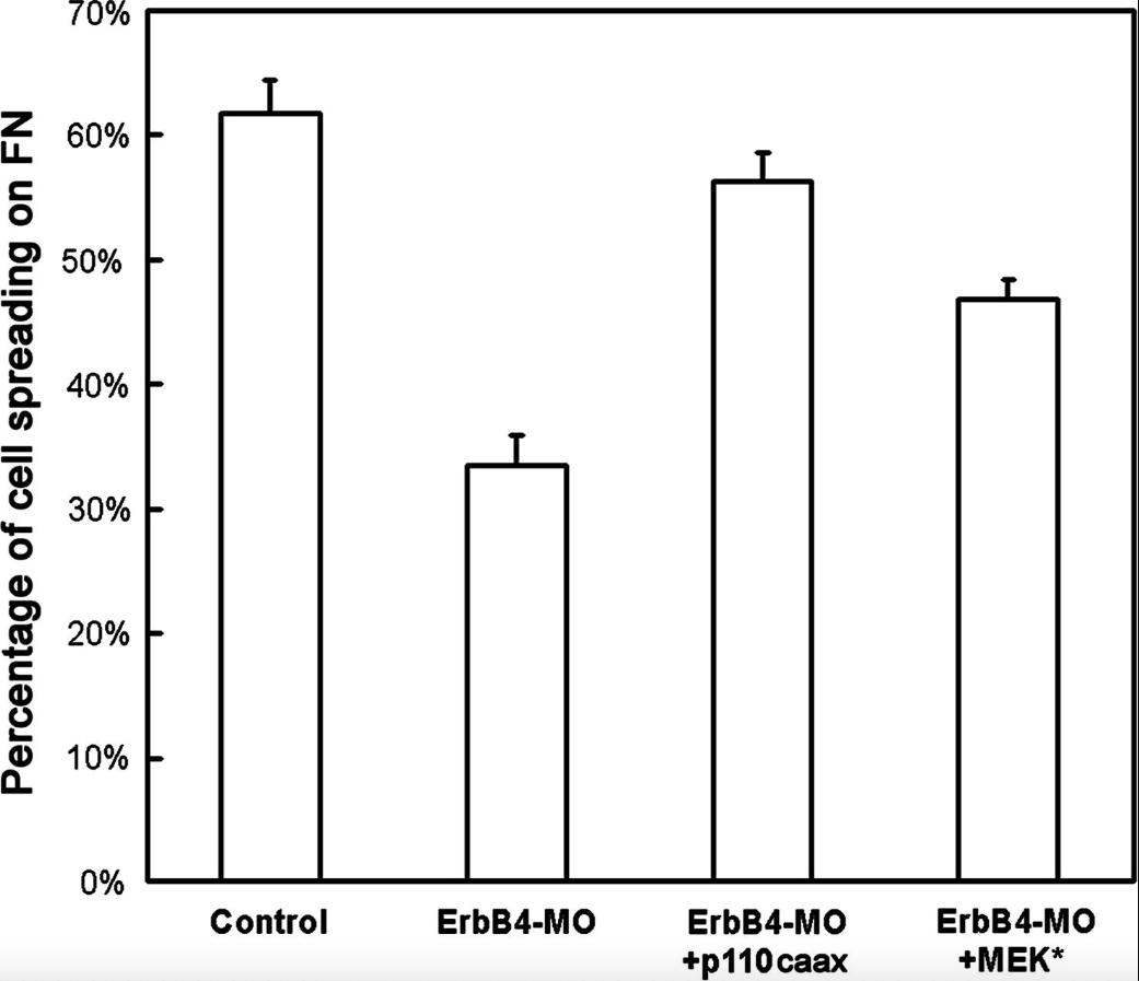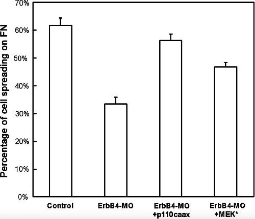 Fig. 9. PI3K rescued mesodermal cell spreading on fibronectin more efficiently than MAPK. The morphology of the mesodermal cells attached to fibronectin was examined and the number of the spreading cells was quantified in the bar graph. While ErbB4-MO (20 ng/embryo) reduced cell spreading on FN matrix, coinjection of p110caax or MEKâ (5â10 pg mRNA/embryo) increased the percentage of the spreading cells significantly (p < 0.0001 compared with ErbB4-MO alone). Expression of p110caax, but not MEKâ, rescued cell spreading to a level comparable to that of the control cells (p = 0.14 and 3E-05 for p110caax and MEKâ, respectively, compared with the control).