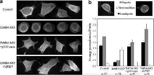 Fig. 10. Activation of PI3K and MAPK restored the formation of membrane protrusions in cells from ErbB4 morphant embryos. Membrane-tethered EGFP was used to label cell membrane, and formation of the cell protrusions in dissociated DMZ cells on FN matrix were observed by time lapse movies. (a) Cells from ErbB4 morphant embryos (20 ng ErbB4-MO/embryo) showed reduced filopodia and lamellipodia, but with increased membrane blebs. Coexpression of p110caax or MEKâ (5â10 pg mRNA/embryo) restored the formation of lamellipodia and filopodia. (b) Quantification of the membrane protrusions. Lamellipodia, filopodia and membrane blebs were counted separately and summarized in the bar graph. ErbB4-MO reduced the average lamellipodia and filopodia from 1.7 and 3.7 to 0.3 and 0.7 per cell per minute, respectively, while increased the formation of the membrane blebs from 0.2 to 1.4 per cell per minute (p-values less than E-10 for all type of protrusions, as assayed by Studentâs t-test). Coexpression of p110caax and MEKâ restored the frequencies of lamellipodia and filopodia (p > 0.05 for all protrusions compared with the control cells), with MEKâ stimulating filopodia more efficiently. The total numbers of the cells counted were given under the bar graph.