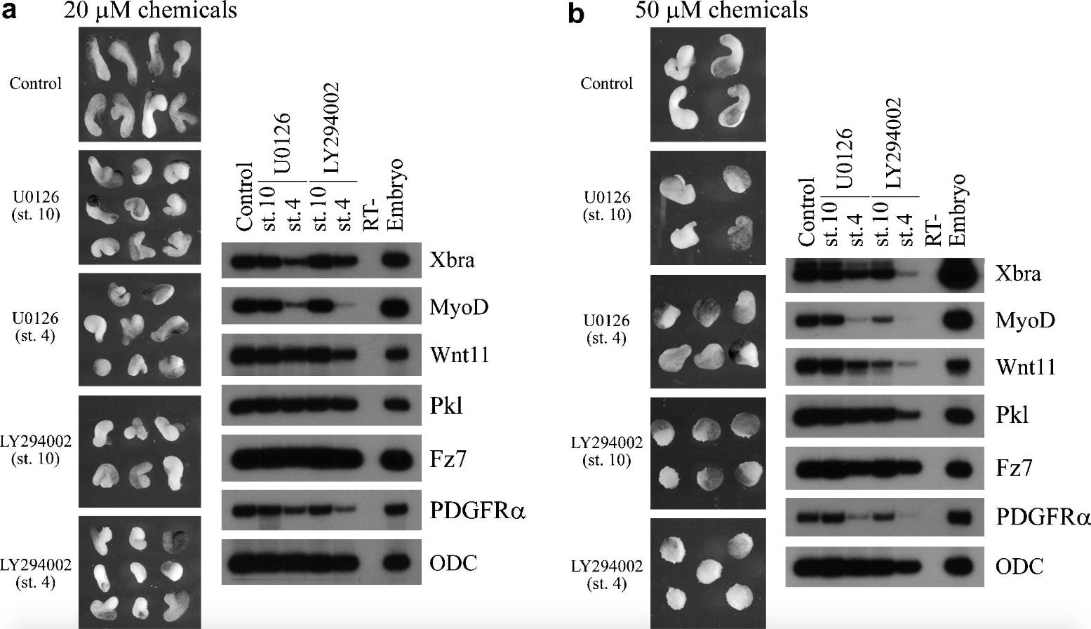 Fig. 1. MAPK and PI3K regulate mesoderm formation and gastrulation at different developmental stages in Xenopus. Embryos were incubated with the MAPK inhibitor U0126 or the PI3K inhibitor LY294002 at 20 μM (a) or 50 μM (b) from stage 4 or stage 10 onward. DMZ explants were dissected at stage 10, mesodermal markers were analyzed by RT-PCR at stage 11, and the morphology of the explants was examined at stage 16. While both inhibitors reduced the elongation of the DMZ explants in a dose-dependent manner when applied from either early or late stages, only inhibitors applied from stage 4 could efficiently block expression of a panel of mesodermal markers.
