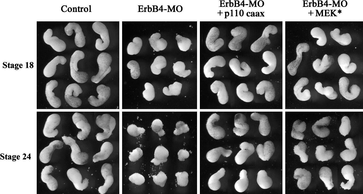 Fig. 4. Activation of PI3K or ErkMAPK rescued convergent extension of DMZ explants from ErbB4 morphant embryos. Coexpression of 5â10 pg mRNA/embryo of p110caax or MEKâ rescued elongation of the DMZ explants from ErbB4 morphant embryos (20 ng ErbB4-MO/embryo) at mid-neurula (stage 18) and tailbud (stage 24) stages. At tailbud stages, explants from ErbB4-MO injected embryos started to dissociate, and p110caax prevented cell shedding more efficiently than MEKâ did.