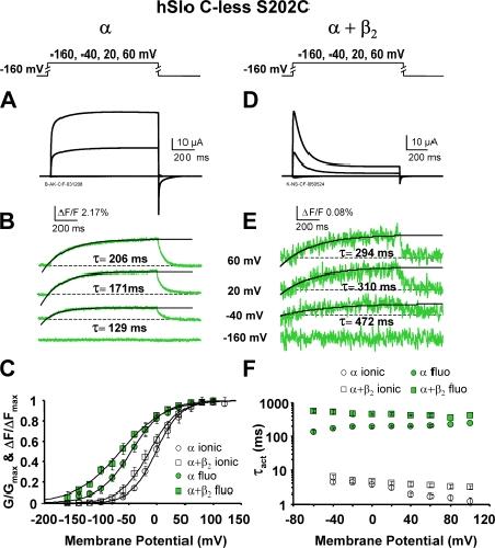 The beta(2) subunit of the large conductance Ca(2+)- and voltage-activated K(+) channel (BK(Ca)) modulates a number of channel functions, such as the apparent Ca(2+)/voltage sensitivity, pharmacological and kinetic properties of the channel. In addition, the N terminus of the beta(2) subunit acts as an inactivating particle that produces a relatively fast inactivation of the ionic conductance. Applying voltage clamp fluorometry to fluorescently labeled human BK(Ca) channels (hSlo), we have investigated the mechanisms of operation of the beta(2) subunit. We found that the leftward shift on the voltage axis of channel activation curves (G(V)) produced by coexpression with beta(2) subunits is associated with a shift in the same direction of the fluorescence vs. voltage curves (F(V)), which are reporting the voltage dependence of the main voltage-sensing region of hSlo (S4-transmembrane domain). In addition, we investigated the inactivating mechanism of the beta(2) subunits by comparing its properties with the ones of the typical N-type inactivation process of Shaker channel. While fluorescence recordings from the inactivated Shaker channels revealed the immobilization of the S4 segments in the active conformation, we did not observe a similar feature in BK(Ca) channels coexpressed with the beta(2) subunit. The experimental observations are consistent with the view that the beta(2) subunit of BK(Ca) channels facilitates channel activation by changing the voltage sensor equilibrium and that the beta(2)-induced inactivation process does not follow a typical N-type mechanism.