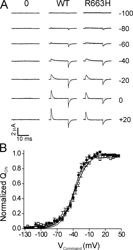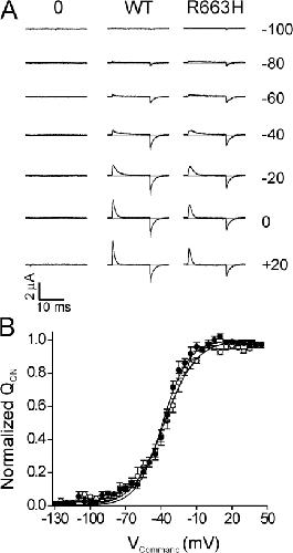 Figure 1. Gating charge displacement of rNaV1.4 WT and R663H channels. Oocytes were held at −100 mV, and gating charge displacement was determined by a series of 15-ms voltage commands between −130 and +40 mV in 5-mV increments, following a 15-ms prepulse to −130 mV. Linear leak and capacitance currents were subtracted by a P/−8 protocol from −130 mV. Bath solutions contained TEA+ as the predominant cation. Representative gating currents are displayed in A, for a mock-injected oocyte (0), and oocytes expressing WT or R663H channels (denoted at top). Command voltages eliciting the currents in each trace are displayed at the right. The voltage dependence of normalized QOn charge displacement is shown in B, for WT channels (open circles, n = 8), and R663H mutants (filled circles, n = 7). Curves are fit with a Boltzmann function yielding the following values: WT, V1/2 = −37.3 ± 2.4 mV, k = 13.3 ± 0.6 mV; and R663H, V1/2 = −38.7 ± 1.9 mV, k = 11.0 ± 0.6 mV).