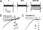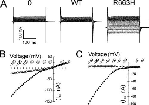 Figure 2. R663H channels are associated with an aberrant inward current. In A, representative steady-state current responses to 300-ms voltage commands between −140 and +30 mV from a holding potential of −100 mV are shown, for mock-injected oocytes (0), or oocytes expressing WT or R663H channels (denoted at top; recordings are from the same oocytes whose gating charge movement is depicted in Fig. 1 A). The mean steady-state current during the last 100 ms of the command pulse is plotted versus voltage in B, for mock-injected (open squares, lying beneath WT points), WT- (open circles), and R663H-expressing oocytes (filled circles). The R663H-expressing oocyte exhibits a hyperpolarization-induced inward current not observed in the WT expressing oocyte. C depicts the R663H and WT-associated currents (same data as in B) after subtraction of the mean nonspecific leak from a pooled population of mock-injected oocytes.