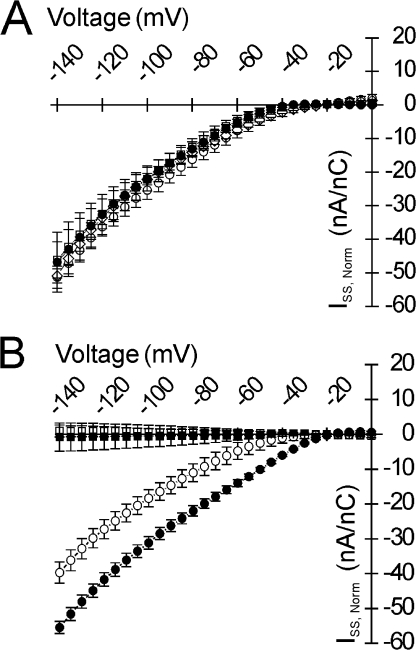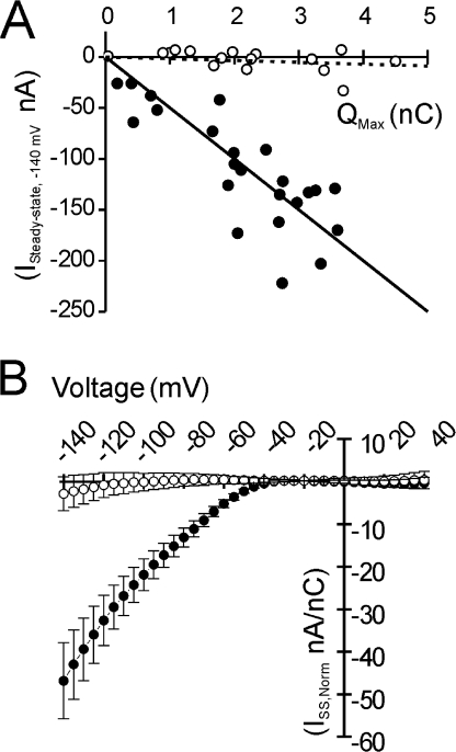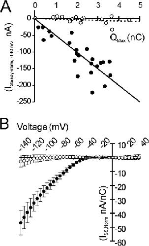 Figure 3. R663H channels are the origin of the aberrant inward current. In A, the nonspecific leak from a pooled population of mock-injected oocytes was subtracted from steady-state currents from both WT- and R663H-expressing oocytes. The leak-corrected current amplitudes elicited by the −140 mV command voltage are plotted against maximal gating charge displacement for individual oocytes expressing WT (open circles) or R663H channels (filled circles). Linear fits to the data are overlaid. The amplitude of the nonlinear, inward current scales with increased R663H channel expression (black line), whereas no aberrant inward current is evident in oocytes expressing comparable levels of WT channels (dotted line). In B, this scaling is used to normalize current amplitudes from different oocytes to corresponding Qon,Max, to facilitate comparison across oocyte populations exhibiting different levels of Na+ channel expression. A prominent inward current is characteristic of R663H-expressing oocytes (filled circles), whereas there is little aberrant inward current in WT-expressing oocytes (open circles).