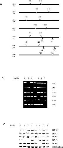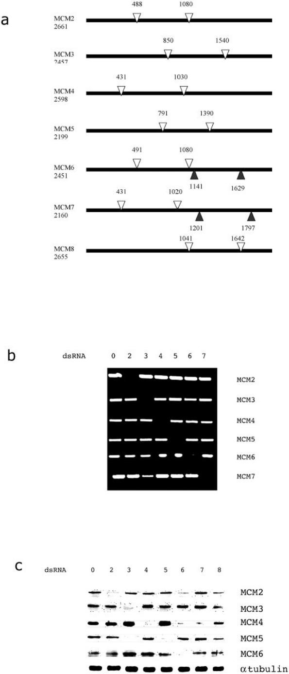Figure 2. a. Schematic detailing the regions of each MCM targeted for dsRNA.Base positions are quoted relative to the start AUG. Shaded arrows designate the 2nd dsRNA made from MCM6/7. b. Agarose gel of RT-PCR products showing the effects of RNAi depletion of individual MCMs on MCM mRNA expression levels. Horizontal numbers designate the MCM targeted by RNAi. Vertical numbers show the RT PCR target. The data presented is one complete representative data set from multiple repetitions. c. Western blot to show the effect of RNAi depletion of individual MCMs on MCM protein expression levels in total cell extracts. Horizontal numbers designate the MCM targeted by RNAi. Vertical numbers show the antibody used for western blotting. Tubulin expression is included as a loading control. The data presented is one complete representative data set from multiple repetitions.