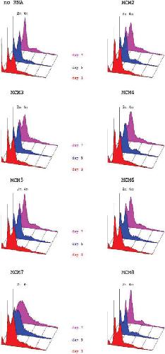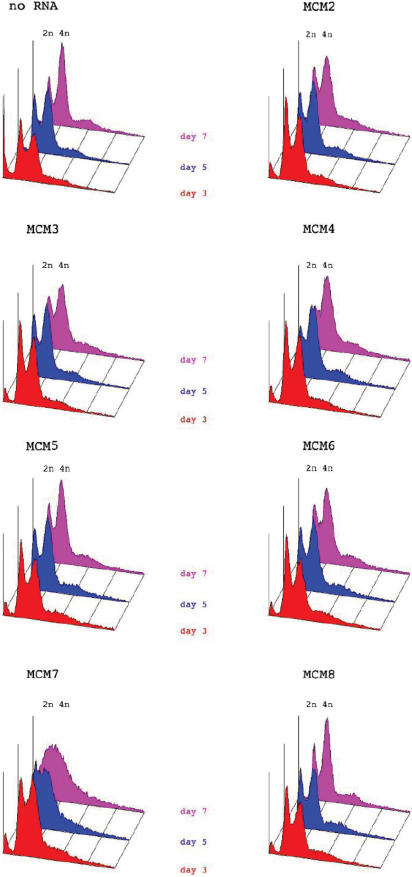 Figure 5. FACS analysis profiles of cells targeted with dsRNA against MCM2-7 proteins as compared to control targeted cells.The data presented is one complete representative data set from multiple repetitions.