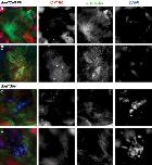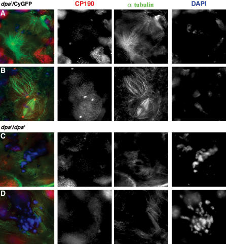 Figure 1. Dpa1 mutants show abnormal chromosome condensation and unorganised mitotic spindles.Neuroblasts of heterozygous or homozygous third instar larvae (prepared as in 4) were stained for: centrosomes (red) using CP190 antibodies (a kind gift from Will Whitfield) and Goat anti-rabbit TxRed (Jackson labs); spindles (green) using anti-tubulin (Clone DM1A-Sigma) and goat anti-mouse Alexa 488 (Jackson Labs); and DNA (blue) using DAPI (Sigma). Heterozygous neuroblasts showed normal spindles with correct localization of CP190 at the poles in metaphase (A/B) and anaphase (B), and normally condensed chromosomes. Homozygous neuroblasts (C/D) showed fragmented, hyper-condensed and aneuploid chromosomes, and disorganised mitotic spindles usually lacking CP190.