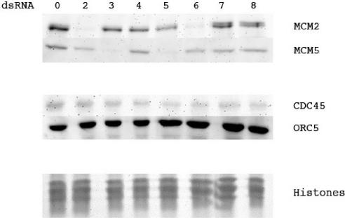 Figure 3. Immunoblot to show the effect of MCM depletions on the levels of MCM2, MCM5 ORC5 and CDC45 bound to chromatin.Coomassie stained histones are included as a loading control. The amount of each protein was compared to the histones using Alpha Innotech imager software. Horizontal numbers show the MCM protein targeted by RNAi. Several repetitions of this experiment were performed and this represents 1 complete data set.