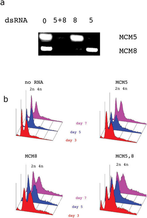 Figure 6. a. Agarose gel of RTPCR products to show the effects of RNAi depletion of MCM5 and MCM8 and MCM 5 plus 8 on the MCM5 and 8 levels.b. FACS profiles of cells targeted with dsRNA against MCM8, and MCM5 plus MCM8. The data presented is one complete representative data set from multiple repetitions.