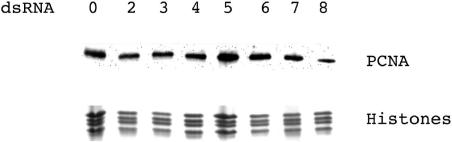 Figure 7. Immunoblot to show the effect of MCM depletions on the levels of PCNA bound to chromatin.Coomassie stained histones are included as a loading control. The amount of PCNA was compared to the histones using Alpha Innotech imager software. Horizontal numbers show the MCM protein targeted by RNAi.