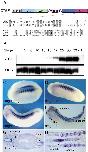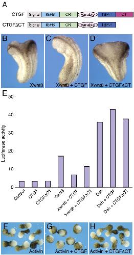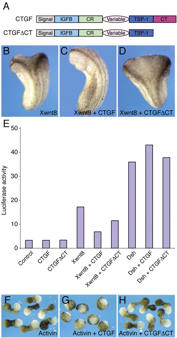 Fig. 4. Inhibition of WNT signalling requires the CT domain of CTGF. (A) Domain structures of CTGF and CTGFδCT. (B-D) CTGFδCT cannot inhibit induction of secondary axes by Xwnt8. (B) Secondary axis induced by Xwnt8. (C) Inhibition of secondary axis formation by CTGF. (D) CTGFδCT cannot inhibit secondary axis formation. (E) CTGFδCT is a poor inhibitor of Xwnt8-induced activation of the TOPFLASH reporter; CTGF cannot inhibit activation of the TOPFLASH reporter by Dishevelled. Both blastomeres of Xenopus embryos at the 2-cell stage received injections of 20 pg TOPFLASH DNA, 10 pg pRLTK DNA and the indicated combinations of 1 ng CTGF RNA, 1 ng CTGFδCT RNA, 50 pg Xwnt8 RNA and 1 ng Dishevelled RNA. Animal caps were dissected at stage 8, and 20 caps per sample were assayed for Firefly and Renilla luciferase activities 3 hours later. Firefly luciferase activities were then normalised to Renilla activities. This experiment represents a typical result out of three independent experiments. (F-H) CTGFδCT cannot inhibit activin-induced elongation of Xenopus animal caps. (F) Animal caps treated with 8 units/ml of activin protein undergo elongation. (G) Animal caps derived from embryos injected with 1 ng Ctgf RNA do not undergo elongation. (H) Elongation of animal caps is not inhibited by 1 ng of CtgfδCT RNA.