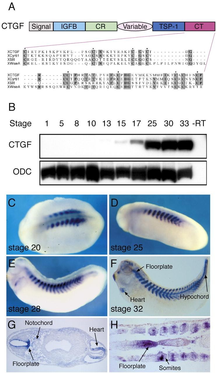 Fig. 1. CTGF and its expression pattern. (A) Schematic representation of the domain structure of CTGF. Shown below is an alignment of the CT domains of xCTGF, XCyr61, XSlit and XWiseA. The eight conserved cysteines are indicated by a dot and amino acids conserved in at least three out of the four proteins are shaded grey. The CT domain of xCTGF shows 52% amino acid identity with XCyr61, 27% with Xslit, and 19% with XWiseA. (B) Temporal expression pattern of Ctgf studied by reverse transcription-polymerase chain reaction. Stages are according to Nieuwkoop and Faber (Nieuwkoop and Faber, 1975). Ornithine decarboxylase (ODC) acts as a loading control. Note the absence of maternal expression of CTGF. (C-H) In situ hybridisation analysis of CTGF expression. (C) Stage 20. Expression is detectable in the somites and axial midline. (D) Stage 25. Expression persists in somites and axial midline. (E) Stage 28. Expression is detectable in brain and branchial arches. (F) Stage 32. CTGF is expressed in the heart, in distinct domains in the brain, in the floorplate and in the hypochord. (G,H) Sections through a stage 32 embryo confirm expression of Ctgf in floorplate, heart and somites. CT, C-terminal cystine knot; IGFB, Insulin growth factor binding domain; Signal, signal peptide; TSP-1, thromospondin type 1 repeat; CR, Von Willebrand type C repeat.