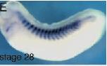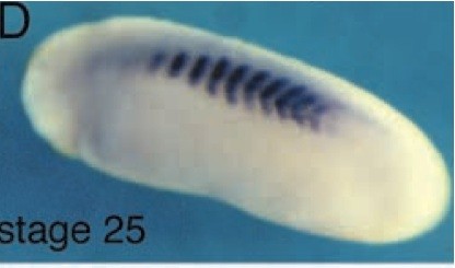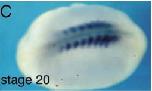 ccn2 (cellular communication network factor 2) gene expression in Xenopus laevis embryo via in situ hybridization, NF stage 28,lateral view, anterior left, dorsla up.