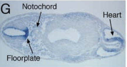 ccn2 (cellular communication network factor 2) gene expression in Xenopus laevis embryo, assayed via in situ hybridization, NF stage 32 , transverse section through heart region, dorsal left.