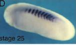 Fig. 2. The effects of overexpression of CTGF resemble those caused by inhibition of WNT signalling. (A) Overexpression of CTGF (bottom embryo) causes a shortening of Xenopus embryos. Three independent experiments were performed with similar results each time. (B,C) Compared with controls (B), CTGF-injected embryos have an enlarged cement gland (C). (D-K) Unilateral overexpression of CTGF causes changes in gene expression that resemble those caused by inhibition of WNT signalling. (D) The expression domain of Otx2 is expanded. (E) CTGF causes a down-regulation of the future hindbrain domain of Pax6 and slightly expands the anterior domain. (F) CTGF causes down-regulation of N-tubulin in the neural plate. (G) The expression domain of Xsox3 in the neural plate is expanded. (H,I) Compared with the control side of the embryo (H), CTGF causes down-regulation of XSox3 in the dorsolateral placode (I). (J) CTGF causes down-regulation of Slug. (K) The muscle-specific gene myosin light chain 1 (MLC1) is down-regulated by Ctgf. I: injected; NI: Not injected. The injected sides of embryos are identified by pale blue lacZ staining.