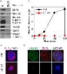 Figure 2. ELYS Is Required for Nuclear Pore Complex Assembly(A) Sperm chromatin was incubated in nonimmune or ELYS-depleted egg extract for 90 min. Chromatin was then isolated and immunoblotted for ELYS, Nups133, 358, 214, 153, 62, and Mcm2. The lower portion of the gel was stained with Coomassie blue so that the level of histones could be determined as a control for chromatin recovery.(B) DNA synthesis was assayed in nonimmune and ELYS-depleted extracts.(C) Sperm chromatin was incubated in nonimmune or ELYS-depleted egg extract treated with 10μg/ml DilC18 (red). Nuclei were fixed and spun onto coverslips and counterstained with DAPI (blue). The scale bar represents 10 μm.(D) Nuclei assembled in nonimmune or ELYS-depleted egg extract were fixed, spun onto coverslips, and stained with mAb414 (green) and ELYS antibodies (red) and DAPI (blue).