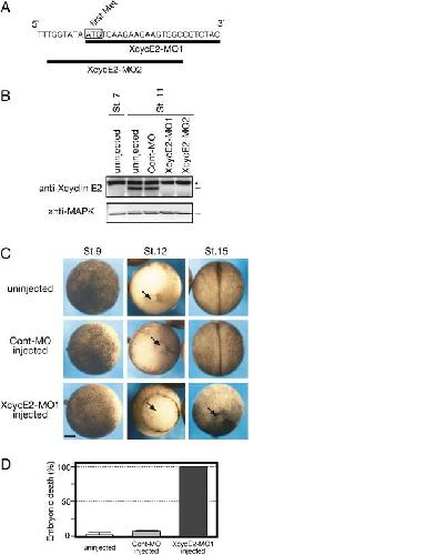 Sufficient loss of Xcyclin E2 is lethal during late gastrulation. (A) Two types of morpholino oligos for Xcyclin E2 (XcycE2-MO1 and -MO2) were targeted to underlined sequences, respectively. The box indicates the start codon. (B) One-cell stage embryos were uninjected or injected with 80 ng of either Cont-MO, XcycE2-MO1 or XcycE2-MO2, cultured, collected when uninjected embryos reached at stages 7 and 11, and analyzed by Western blot with anti-Xcyclin E2 (top) or control anti-MAPK antibodies (bottom). Asterisk indicates non-specific bands. (C) Embryos as in panel B were photographed when uninjected embryos reached the indicated stages. Arrows indicate blastopore. Scale bar, 250 μm. (D) Embryos as shown in panel B were inspected for embryonic death when uninjected embryos reached stage 15. The error bar represents the standard deviation (SD) from triplicate samples.