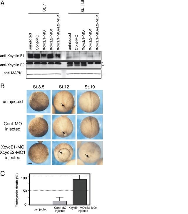 Sufficient loss of both Xcyclin E1 and E2 is embryonic lethal at late gastrulation. (A) One-cell stage embryos were uninjected or injected with 160 ng of Cont-MO, 80 ng of XcycE1-MO or XcycE2-MO1, or each 80 ng of both XcycE1-MO and XcycE2-MO1, cultured, collected when uninjected embryos reached stages 7 (early blastula) and 11.5 (late gastrula), and analyzed by Western blot with anti-Xcyclin E1 (top), anti-Xcyclin E2 (middle) or control anti-MAPK antibodies (bottom). Asterisk indicates non-specific bands. (B) Embryos as in panel A were photographed when uninjected embryos reached the indicated stages. Arrows indicate blastopore. Scale bar, 250 μm. (C) Embryos as in panel A were inspected for embryonic death when uninjected embryos reached stage 15. The error bar represents the SD from triplicate samples.