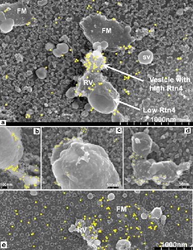 Fig. 2. Immuno-gold labelling shows Rtn4a localises to NE associated membranes. (a) FeiSEM image of the surface of a stage III oocyte NE showing rough ribosome containing vesicles (RV), smooth vesicles (SV) and flattened membrane (FM). The position of anti-Rtn4a immuno-gold particles detected using a backscatter detector is indicated by circles. (b–d) Rtn4a localises to regions of contact between larger membrane structures and the ONM. (e) ER protein, ribophorin, has a more even distribution over flattened membranes, vesicles and the outer nuclear membrane.