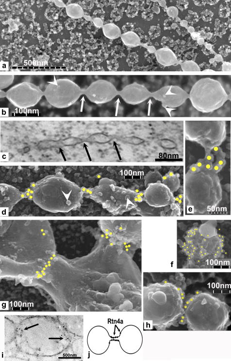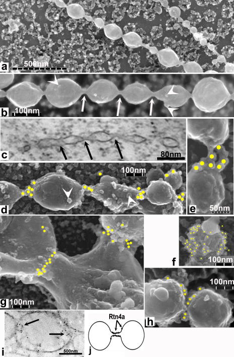 Fig. 1. Membrane structures associated with stage III oocyte NEs have Rtn4a at their membrane-membrane junction. (a and b) feiSEM of strings of vesicle-like structures at the NE showing 20 nm bridges (arrows) and ribosomes (arrowheads). (c) TEM of strings of vesicle-like structure at the NE showing bridges (arrows). (d and e) Rtn4a immuno-gold labelling of strings of vesicle-like structures at the connecting tubule. (f) Some vesicle-like structures have dense labelling of Rtn4a more evenly distributed over the surface. (g and h) Localisation of Rtn4a at the junction between larger membrane structures. (i) TEM sections of oocyte cytoplasmic membranes immuno-gold labelled for Rtn4a (arrows). (j) Our interpretation of these structures and the localisation of Rtn4a. Circles mark the position of immuno-gold particles determined by superimposing a simultaneously obtained backscatter electron image (see Section 4.1).